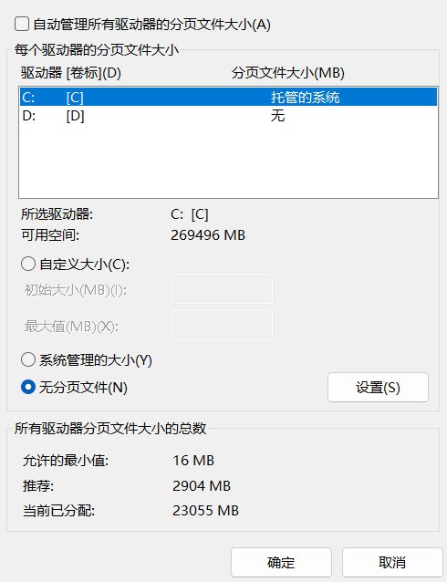 ⑥然后点击【c盘】+选【无分页文件】,点确定