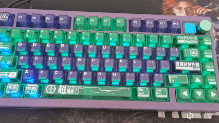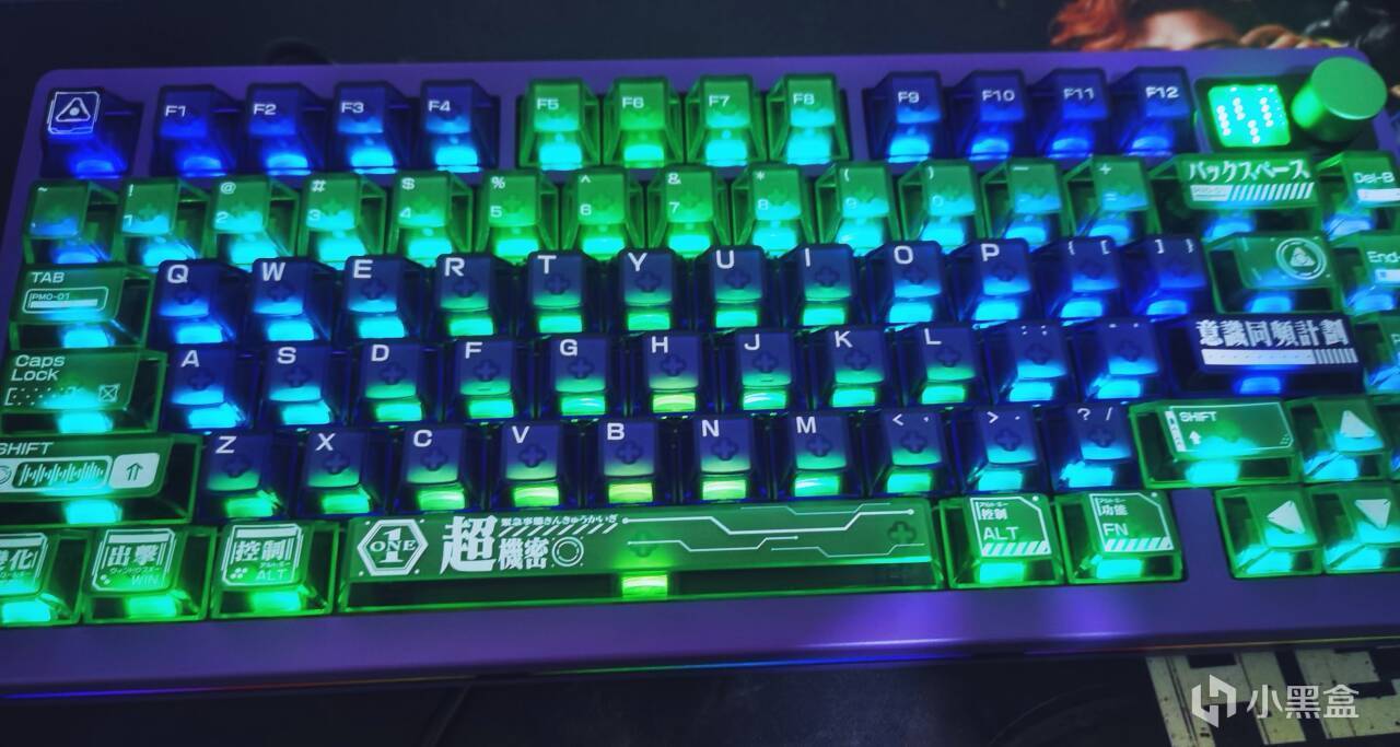 鍵帽是霧透 PC 材質,摸起來帶點磨砂感,字符用的噴塗蝕刻工藝,還有初號機細節圖案,