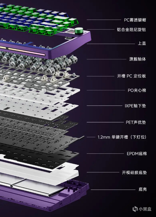 鍵盤採用軟彈Gasket結構,內部5層加厚填充——全系標配Gasket結構+五層填充+開槽定位板+單鍵開槽PCB+定製衛星軸,帶來更加紮實的手感。可以看到整體的結構,內部並無螺絲固定。