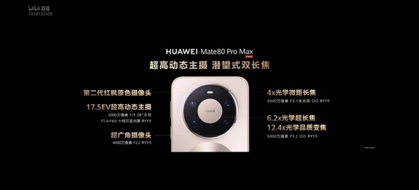 除了这两颗长焦,华为Mate 80 Pro Max还配备5000万像素1/1.28英寸大底超高动态主摄(支持F1.4-F4.0十档可变光圈,采用RYYB阵列)、4000万像素超广角以及红枫原色摄像头,共同组成华为Mate 80 Pro Max的五摄系统。