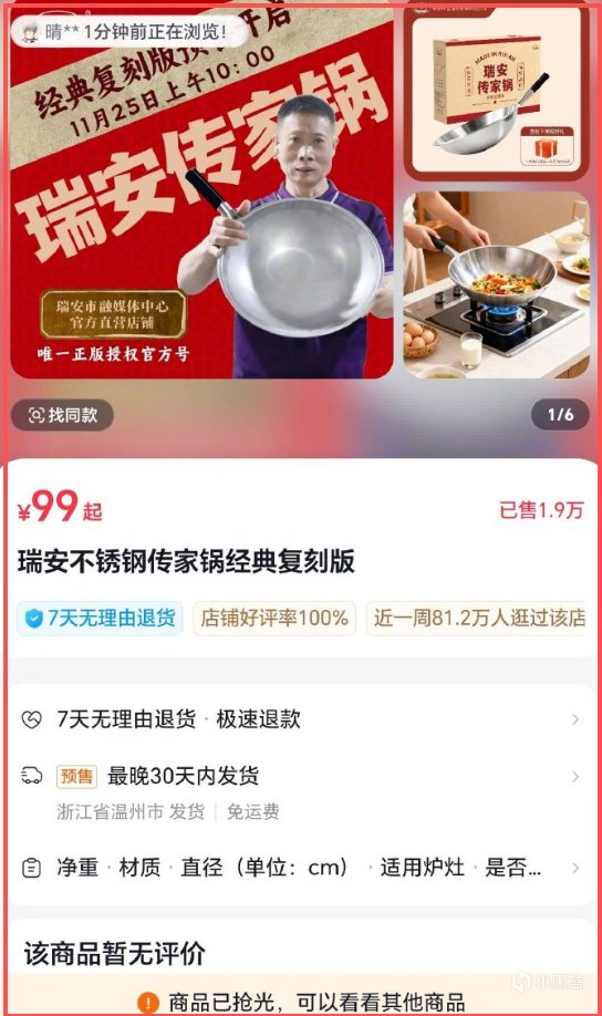 谁能想到,一口用了近 30 年的不锈钢锅,能让网友催着厂家 “复活”。今天,这款被网友冠以 “传家锅” 名号的瑞安不锈钢锅开启预售,2 万个库存 30 秒内被一抢而空,超 10 万网友提前预约却仍有不少人抱憾错过。