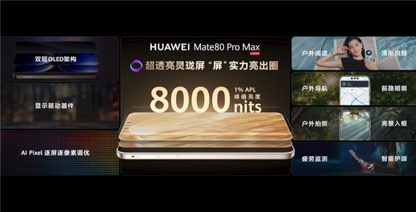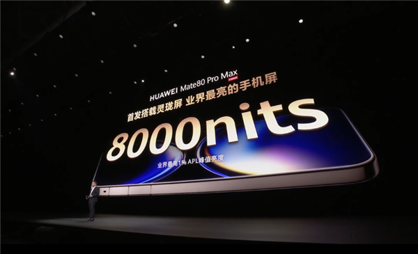 据介绍,华为Mate80 Pro Max首发搭载灵珑屏,具有8000nits峰值亮度,堪称“业界最亮手机屏”。