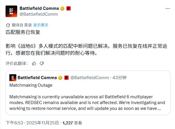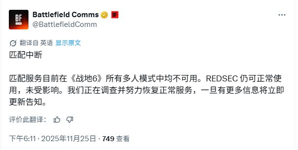 今日,DICE表示目前《戰地6》所有多人模式的匹配服務暫時不可用,禁區衝突仍可正常匹配,未受影響。官方正在調查並努力恢復正常服務,一旦有更多信息將立即更新告知。