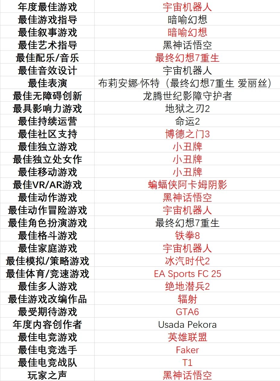 年度游戏是媒体最重视,也是选择最谨慎的奖项。而今年33媒体均分92分,玩家评分创历史新高,金摇杆刚横扫呼声又高,把年度游戏给33是最稳妥的安全牌,不会有其他选项。我估计有人又要说去年机器人,你不会觉得其他提名游戏拿了就不会有争议了吧,机器人相比之下就是最稳妥的选择,换重制版、DLC、二次元、卡牌独游、81分拿年度游戏争议只会更大