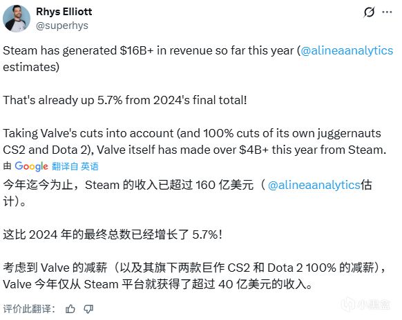 据研究机构Alinea Analytics估算,2025年Steam平台总收入已突破162亿美元,较2024年全年增长5.7%。扣除开发者分成后,Valve自身从Steam获得的净收入超过40亿美元。