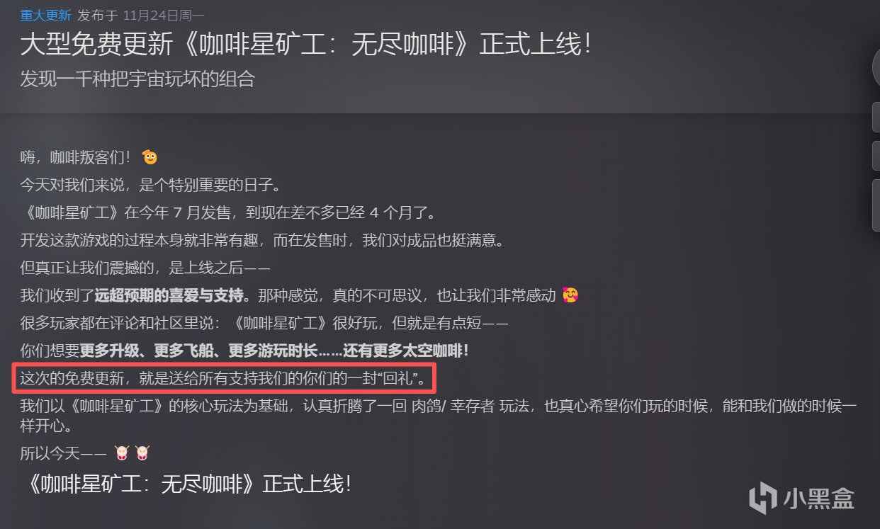 而《咖啡星矿工》的开发团队在听到玩家觉得游戏内容偏短的“尖锐”呼声后,花费了数个月,于昨天正式免费更新了类似《土豆兄弟》的肉鸽类幸存者模式——无尽咖啡。