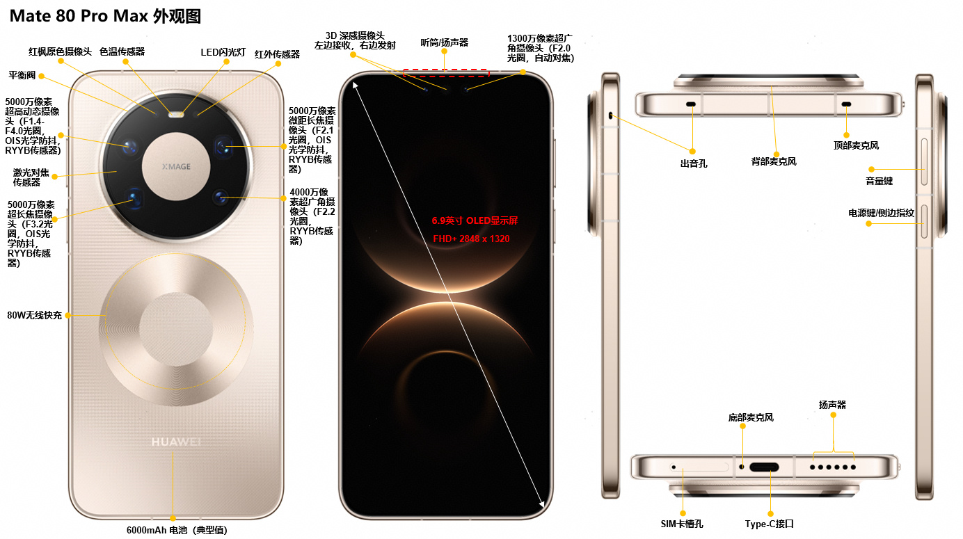 其他:双扬声器,双频GPS四频北斗定位,红外遥控,X轴线性马达,USB 3.1 Gen1接口,IP68+IP69防尘防水,北斗卫星通信,北斗卫星消息,星闪E2.0;