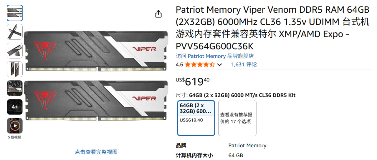 博帝Viper Venom系列64GB DDR5 6000MHz CL36内存:619.40美元