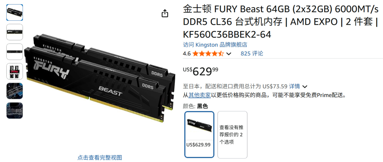 金士顿FURY Beast 64GB DDR5 6000MT/s CL36内存套件:629.99美元