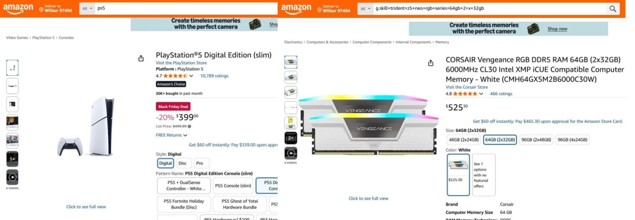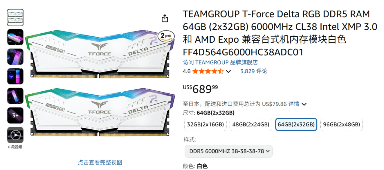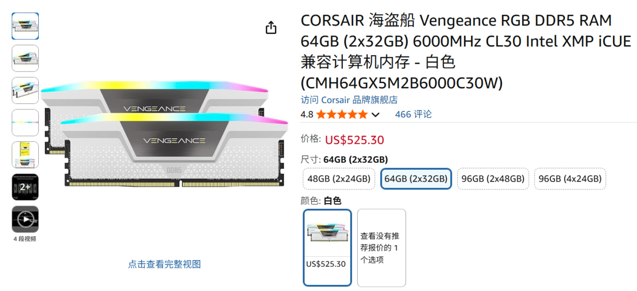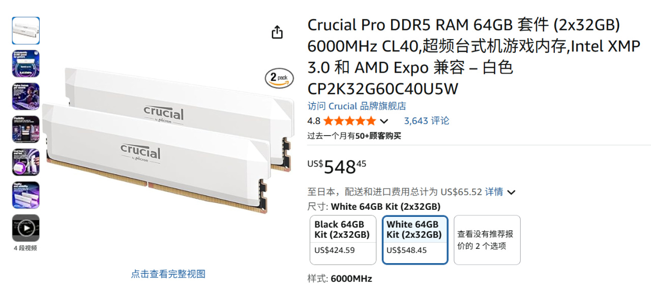 以下为亚马逊平台PS5各版本与多品牌64GB DDR5内存条售价清单: