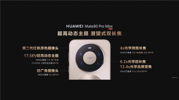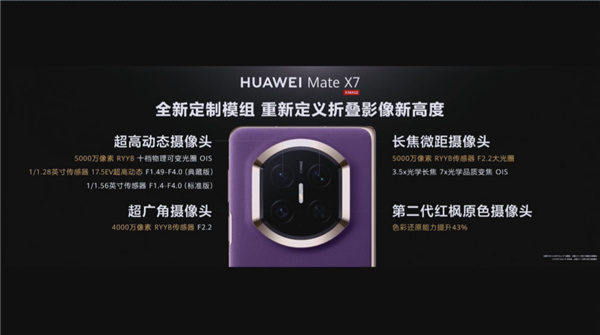 去年 Mate X6 的影像其实就堆得很猛,今年 Mate X7 同样也塞进了全 RYYB 镜头、可变光圈的主摄、潜望长焦以及第二代红枫原色摄像头。