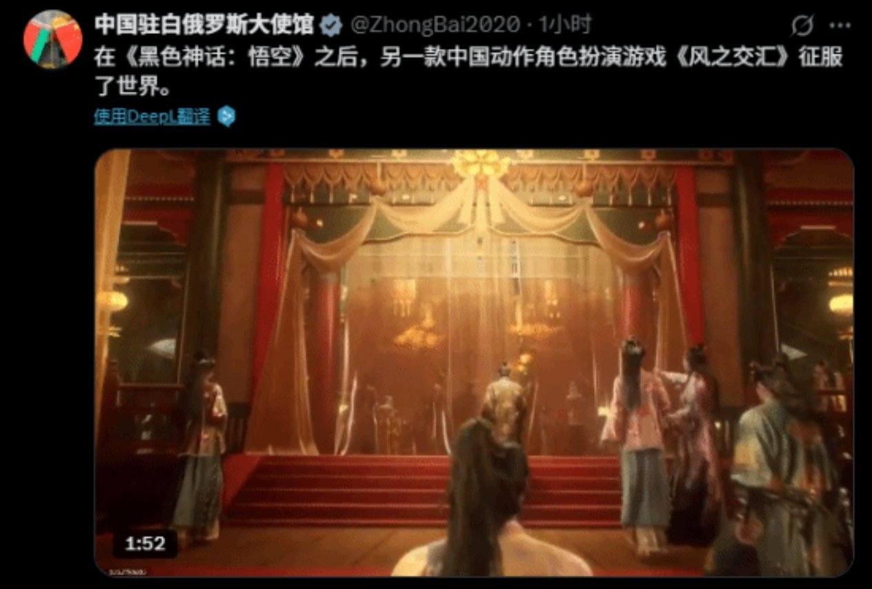中国驻白俄罗斯大使馆官方账号在社交平台上公开称赞该游戏,指出它是中国游戏“征服世界”的又一力作。自11月15日登陆海外市场以来,该作迅速掀起全球武侠热潮。游戏的成功得益于对中华文化的深入挖掘。它以五代十国末至北宋初年为历史背景,构建了一个庞大精致的开放世界,让玩家在武侠冒险中感受中华文化的独特魅力。