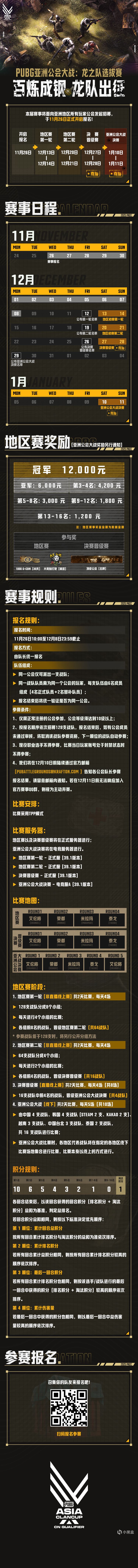 本届赛事面向亚洲PUBG公会开放报名,设立五大赛区。中国赛区将通过选拔诞生4支顶尖战队, 会师总决赛!