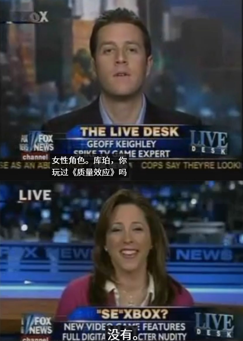但事实却是,偏见一直存在。当Bioware在2007年发布《质量效应》时,仅露出大腿和侧乳的蓝色外星人,就引起了舆论的轩然大波。于是,FOX电视台邀请了彼时还是小年轻的“TGA的主理人”杰夫老哥,与女性社会活动家同台辩论。后者拿出我们熟悉的论调“玩家会分不清游戏与现实”“玩家会对性麻木”“会不正确地对待女性”——但当杰夫哥压住“白眼”的冲动,礼貌询问她是否玩过游戏时,她的回答却是“没有”,她只是云出的道理。