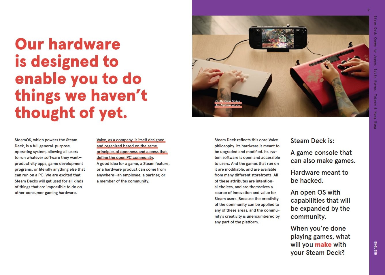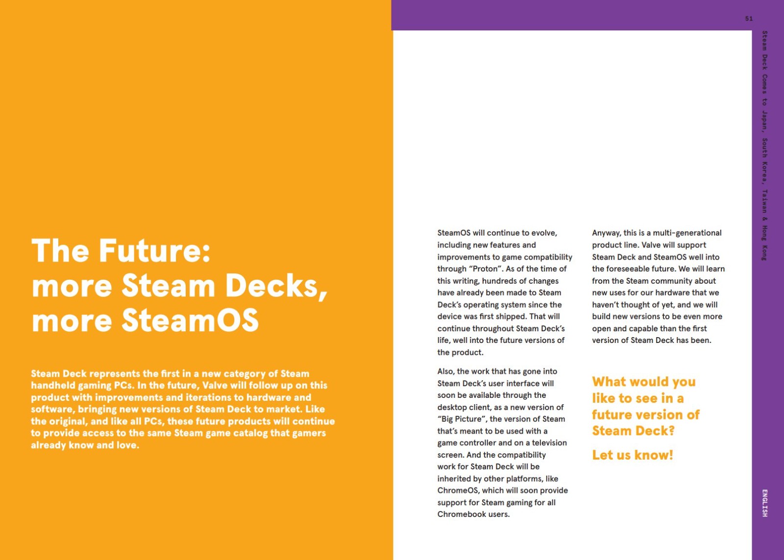昨天V社發佈了關於Steam Deck的50頁小冊子。在小冊子中,有一個名爲“未來:更多Steam Deck,更多SteamOS”的標題,V社透漏他們計劃通過新的硬件和軟件版本爲Steam Deck提供多年的支持。