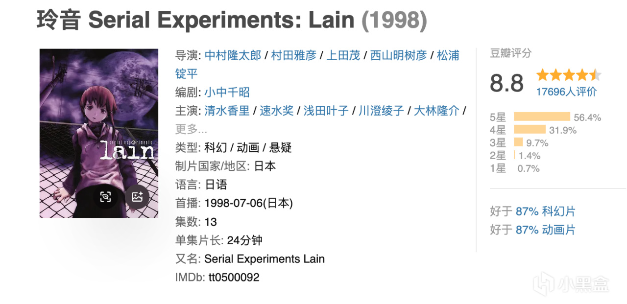 《玲音》是一部1998 年 7 月至 9 月播出的 13 集原創實驗性動畫,由 Production 2nd 企劃,Triangle Staff 製作,中村隆太郎執導。這部作品以其晦澀深邃的哲學思考、獨特的視覺美學和超前的互聯網預言,被譽爲 "賽博朋克動畫的巔峯之作"和 "90 年代末最具前瞻性的文化產物 "