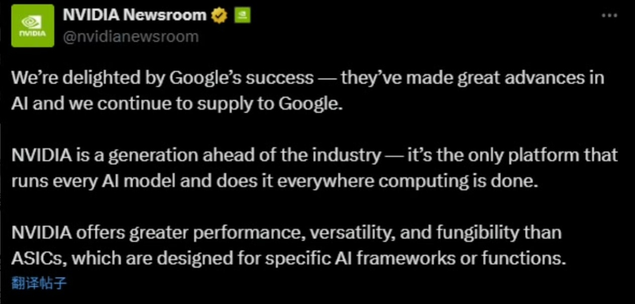 英伟达近日在社交平台X上发文回应市场竞争担忧,强调其技术“领先行业整整一代”,是唯一能够运行所有AI模型并应用于所有计算场景的平台。