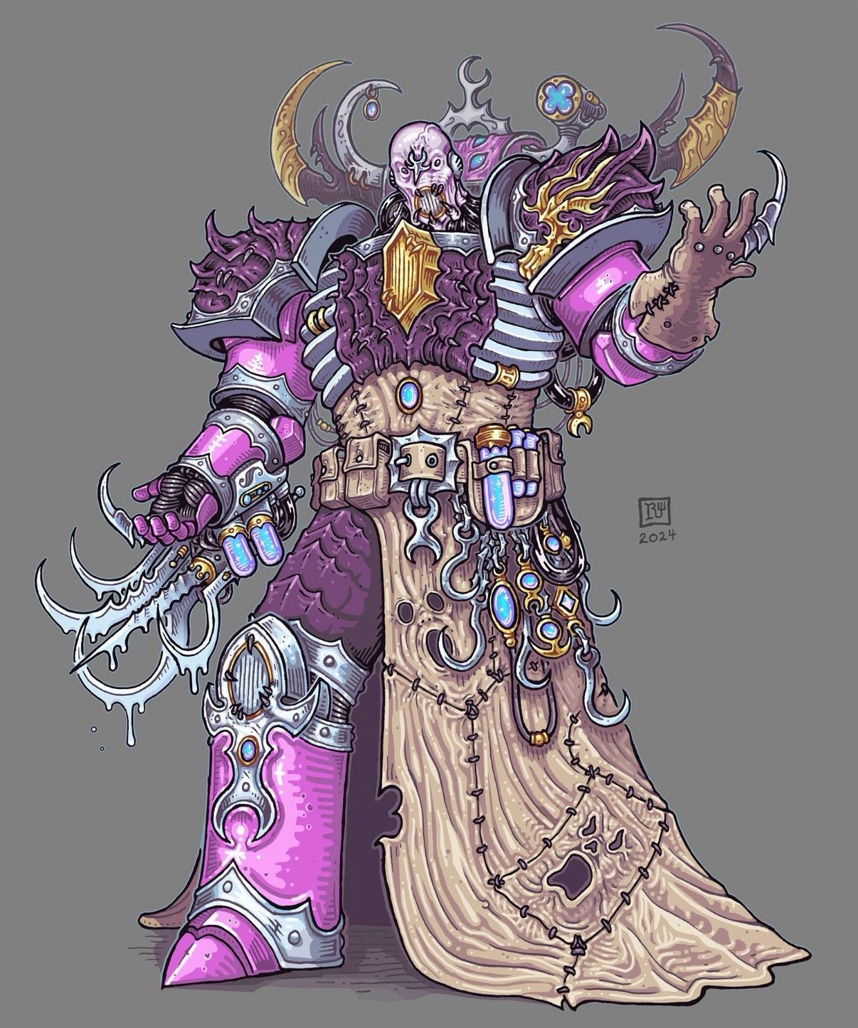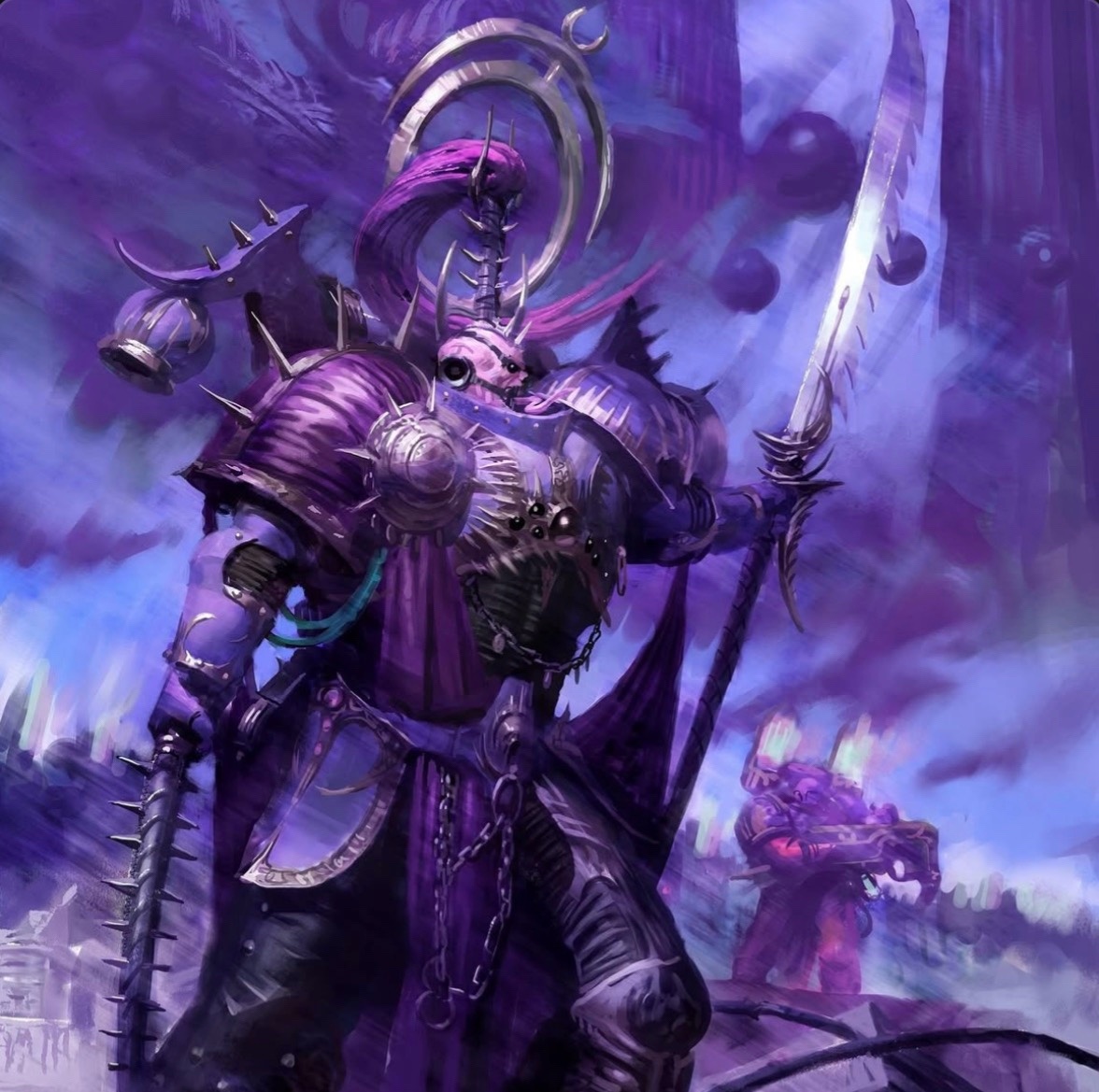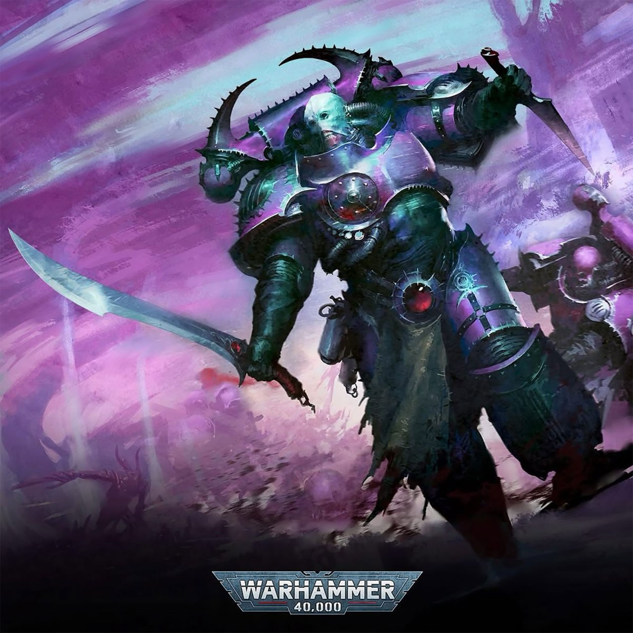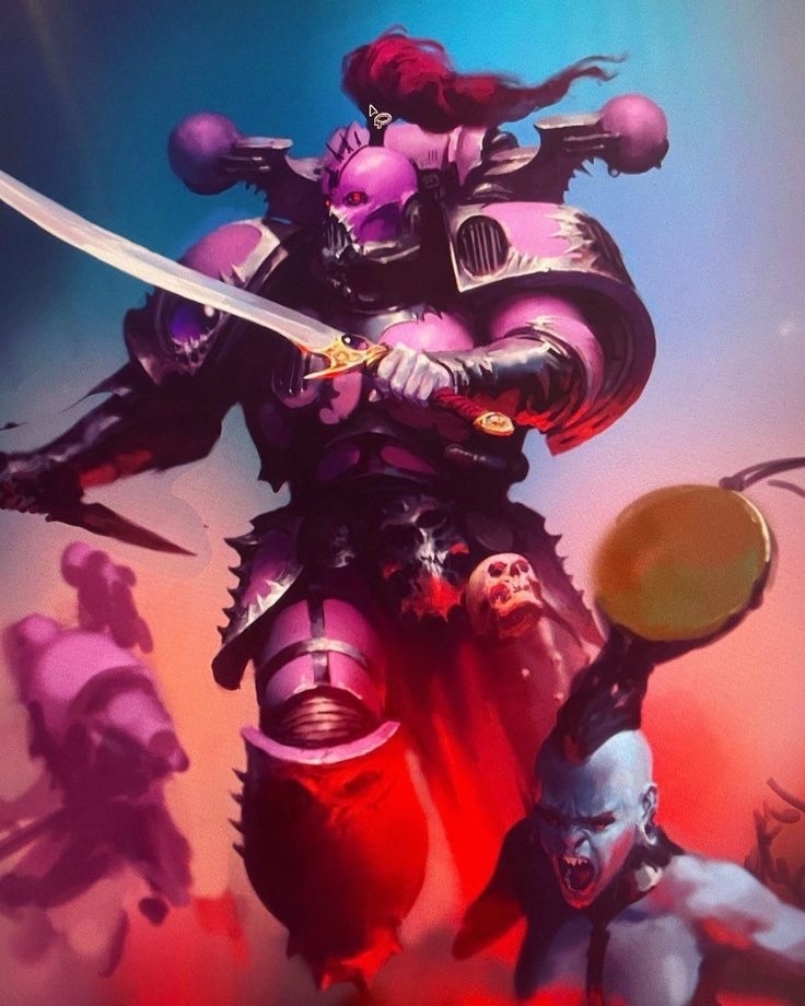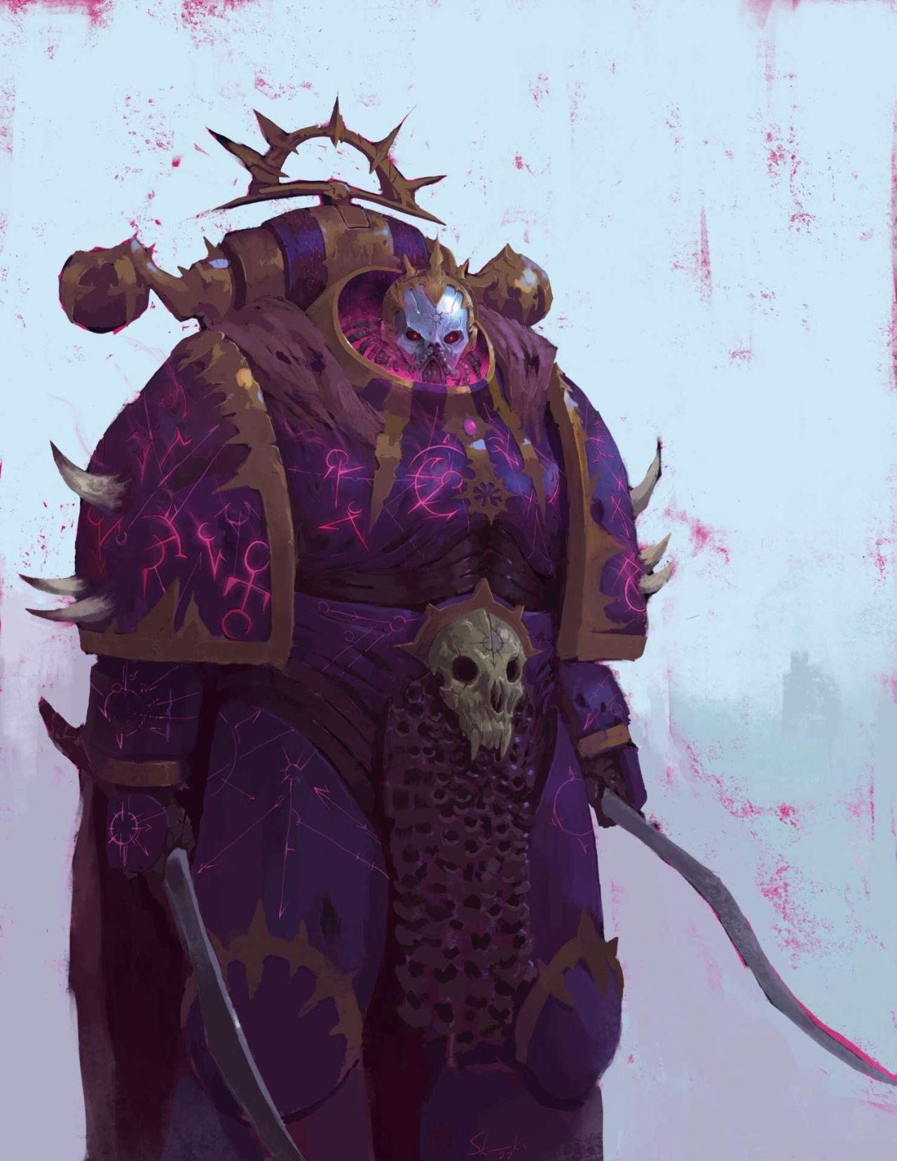 軍團護甲配色變得更加張揚:紫、粉、黑金交織,鎧甲上佈滿誇張的飾釘、面具、皮革與肉體畸變,許多戰士主動接受惡魔賜福,把身體改造成更能“感受一切”的怪異形態。