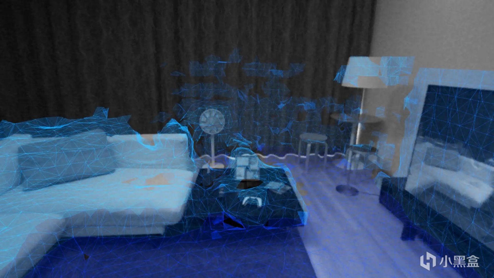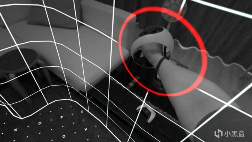 然後會準確地繪製出房間的幾何形狀,以及房間裏的一切,包括傢俱、寵物,甚至是咖啡桌上的剩飯,這非常酷!一旦你劃出一個遊戲區域,PS VR2的守護牆就會從地面升起,清楚地標明你房間的哪些部分是可以安全走動的。