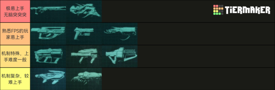 武器上手的难易程度也在T表上,难上手的鬼缚与脊盘切割者非常强,但因为其机制太过复杂不推荐在开荒期使用。