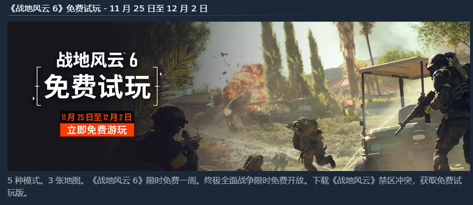 如果你是还没入手战地6的玩家,只需要在Steam搜索《战地风云 禁区冲突》,即可免费下载立即开玩。