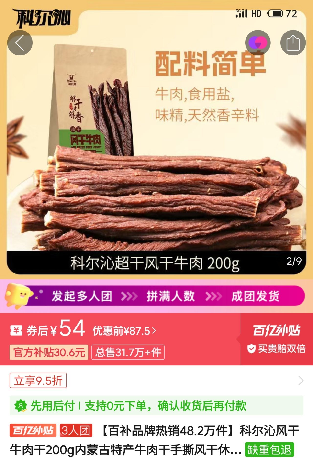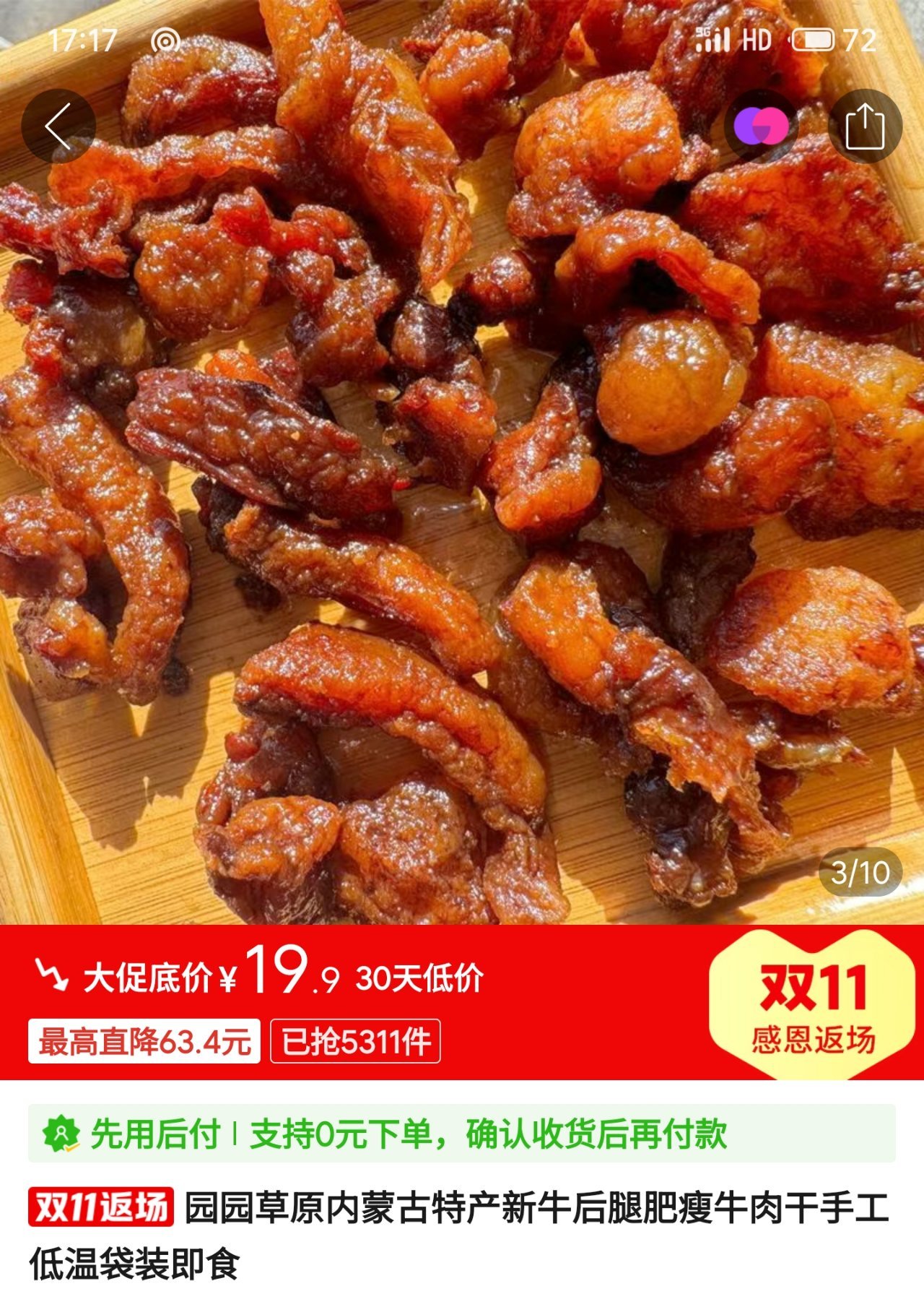 这个牛肥瘦我觉得也无需多言,并不是单纯的牛肉干,上面还带着肥肉,如果在宿舍,我个人喜欢的吃法是把它丢到泡面里增加荤香,同时也丝毫不腻;如果在家就放进空气炸锅略微加热一下,把肥肉里的油稍稍烤出来些,这时候吃掉巨有满足感!!!纯粹的肉香、焦香和油香在嘴里交织,我要是食戟之灵里的人高低要爆个衣的(x)