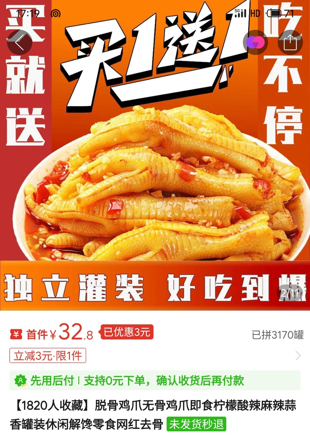 这个无骨鸡爪我买的是蒜香的两斤和赠的柠檬的,不过吃起来都是酸甜口,感觉刚入口的时候柠檬的确实会有柠檬的清香,不过回口有种鸡腥味(这是可以说的吗)..不过蒜香的吃起来就好多了,整体的口味要比柠檬的重一点,固形物也不少,还是蛮推荐蒜香味的(因为我不能吃辣所以没有尝试辣的)