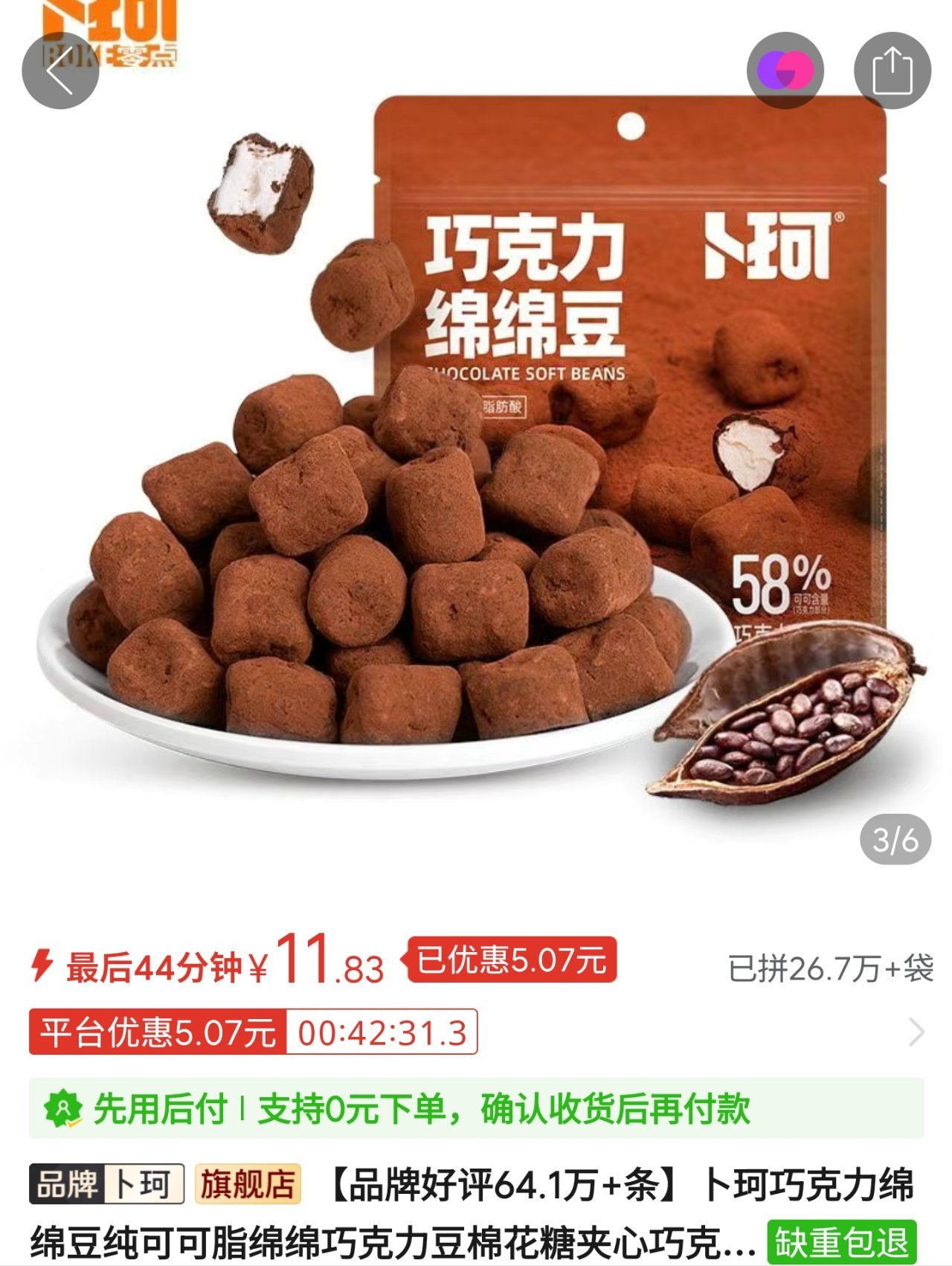 这个是我偶然发现的,没想到吃起来还挺有意思,遂推荐给大家每颗棉花糖的体积都不大,外面是一层巧克力包裹,巧克力带来了一定的苦味,中和了内里棉花糖的甜度,让整个的风味都达到了一种恰好的状态。但是一包不算大,可能刷会b站的功夫就没了