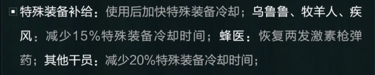大致的恢复效果为:使用后加快特殊装备冷却;乌鲁鲁、牧羊人、疾风:减少15%特殊装备冷却时间;蜂医:恢复两发激素枪弹 药;其他干员:减少20%特殊装备冷却时间;