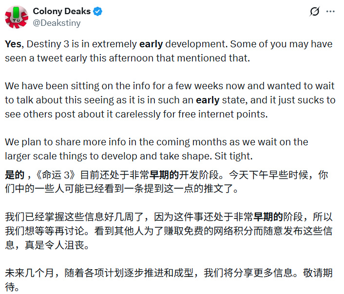 Deaks透露关键时间框架:"鉴于'命运传奇'系列至少持续两年,预计需五年周期。《命运2》完结后全面启动续作开发"。由此推测时间表:Bungie将于2027年完结"命运传奇"系列,随后停止《命运2》支持并加速续作开发,《命运3》最早2030年面世。