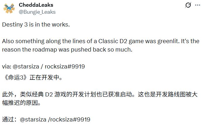 该消息最初由X平台用户@starsiza披露,后获可信爆料人Colony Deaks证实。Deaks表示已掌握情报多时,原计划待项目成型后再公布细节,并指出"《命运3》处于极早期开发阶段,方案可能调整"。去年曾有报道称Bungie因专注《马拉松》导致《命运3》推进缓慢,且不排除会像2024年传闻那样在公布前取消项目。Deaks承诺未来数月将随开发进展披露更多信息。