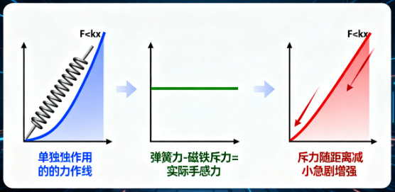 首先你要知道当下磁轴轴体一个困境:遵循胡克定律的轴体弹簧在按下时,弹簧被压缩,按压力度会随着压缩量增加而变大(F=kx,k是弹簧刚度,x是压缩量),这就导致按轴体的 “力曲线” 是越来越陡的上升曲线,表现在手感上即不够平滑。