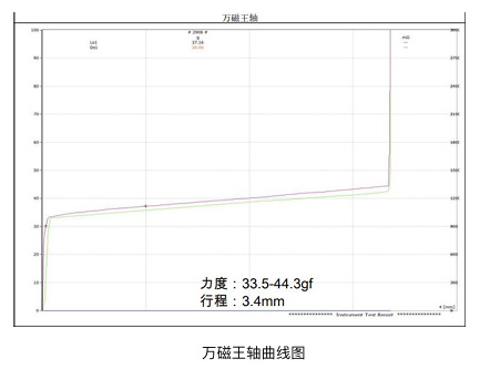 传统磁轴就拿万磁王轴来举例:能看到轴体初始到触底的压力变化曲线是线性的,压力差相对来说比较小,这也是得益于轴体内部长弹簧使得磁轴较常规机械轴初始到触底的压力差较小,压力曲线也更平滑。