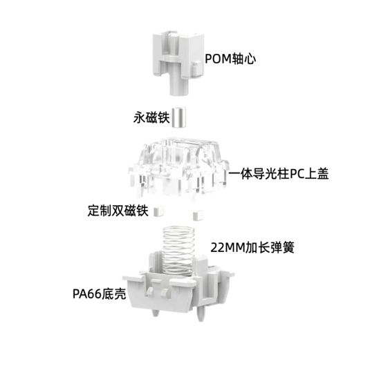 目前单颗售价7.9元,比较贵但我表示认同+理解,宣发内容里简简单单四个字:从0到1,实际轴体内两块磁铁很难找到能将其量产的机器,最终艰难孕育出了这款颠覆性轴体。
