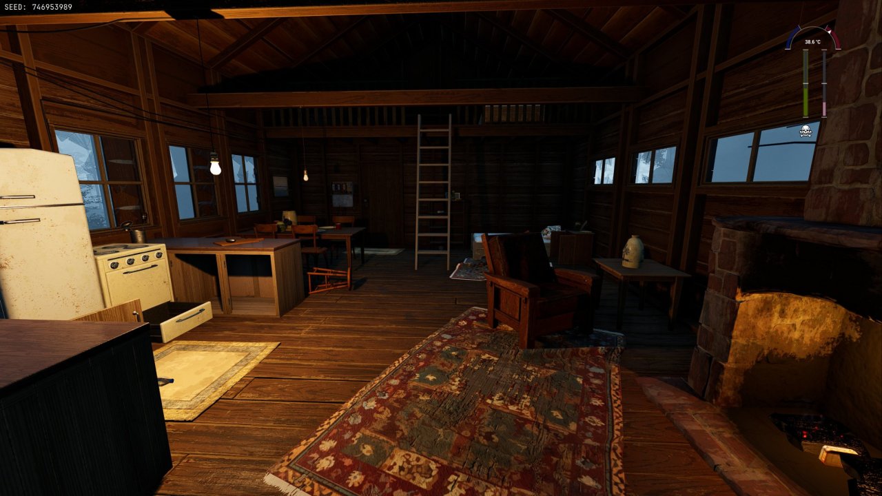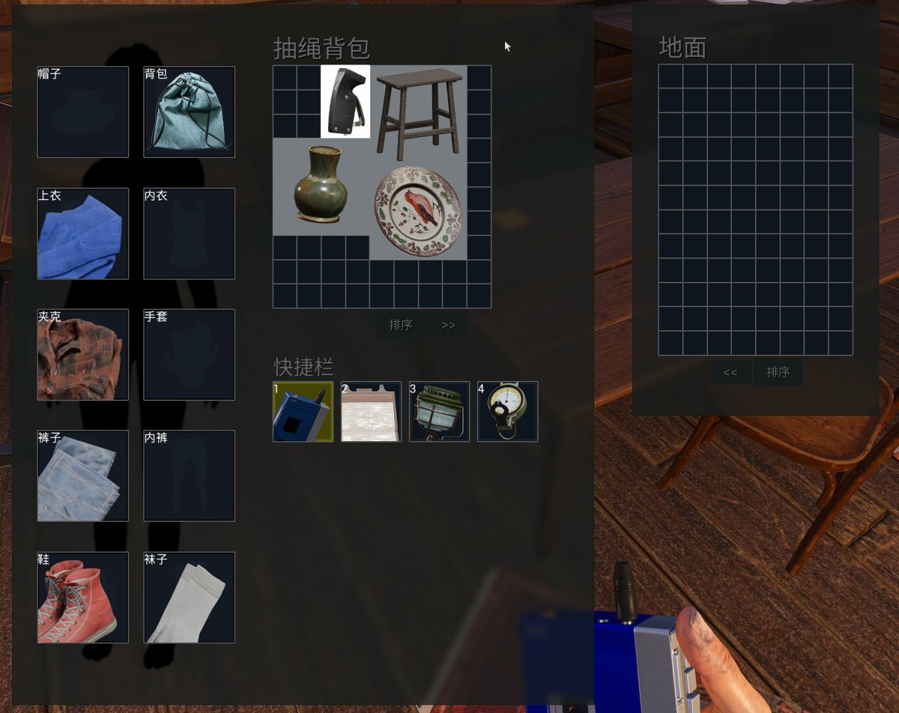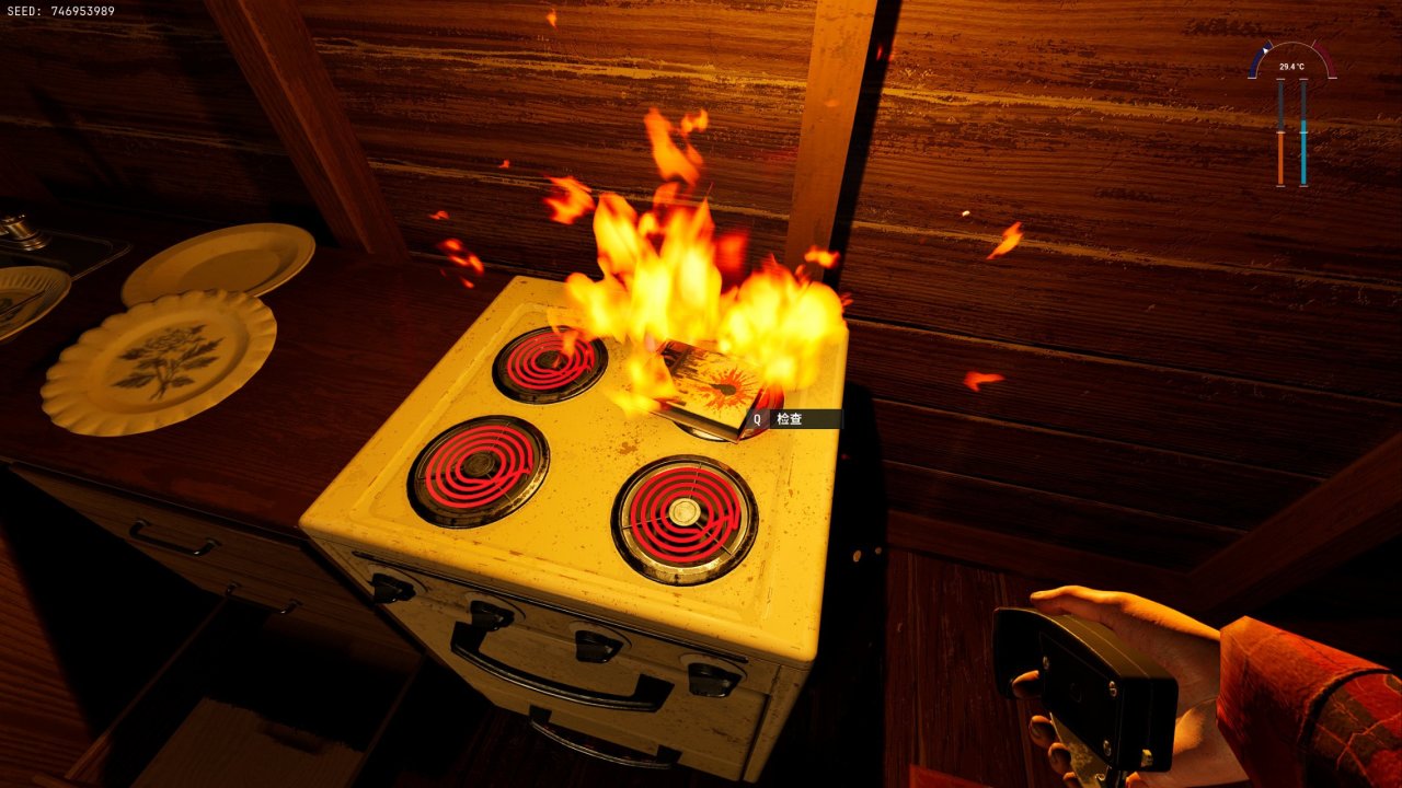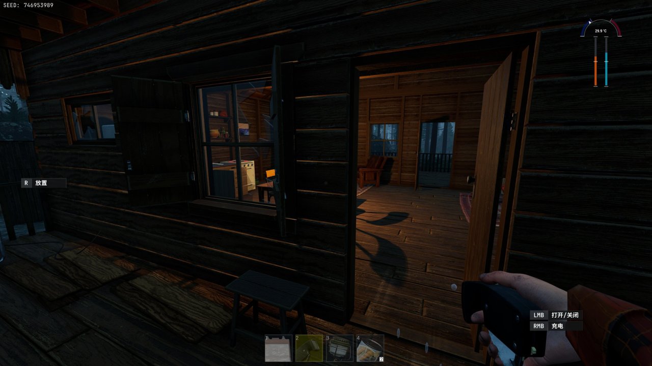 开局玩家在一间小木屋内,周围有非常多的可互动物品,像什么水杯、盘子、椅子等都可以拿起来放在自己的物品快捷栏或是背包里(虽然这些物品看上去都没什么用)。