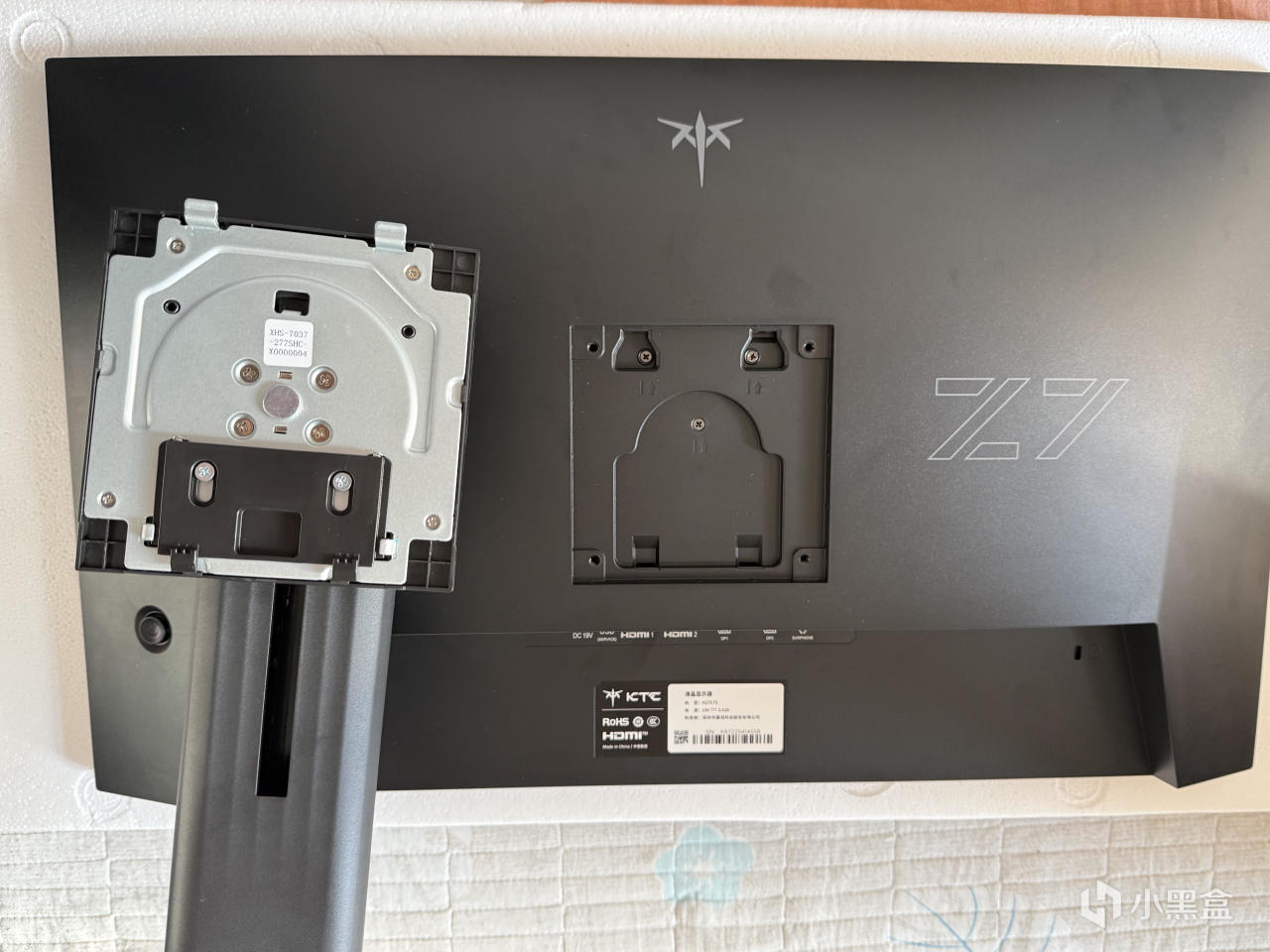 外观采用了三边窄边框设计,最大化提升屏占比,底部是KTC经典logo,整体是磨砂塑料质感