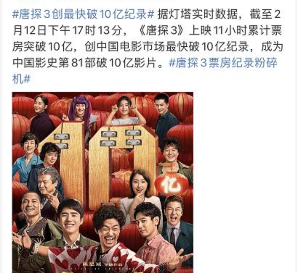 同時也開創了一個歷史,《唐探三》首日十億票房,這個歷史我估計十年內也不會有電影突破了。不過因爲電影質量問題和後續口碑發酵,《你好李煥英》則是後來居上。