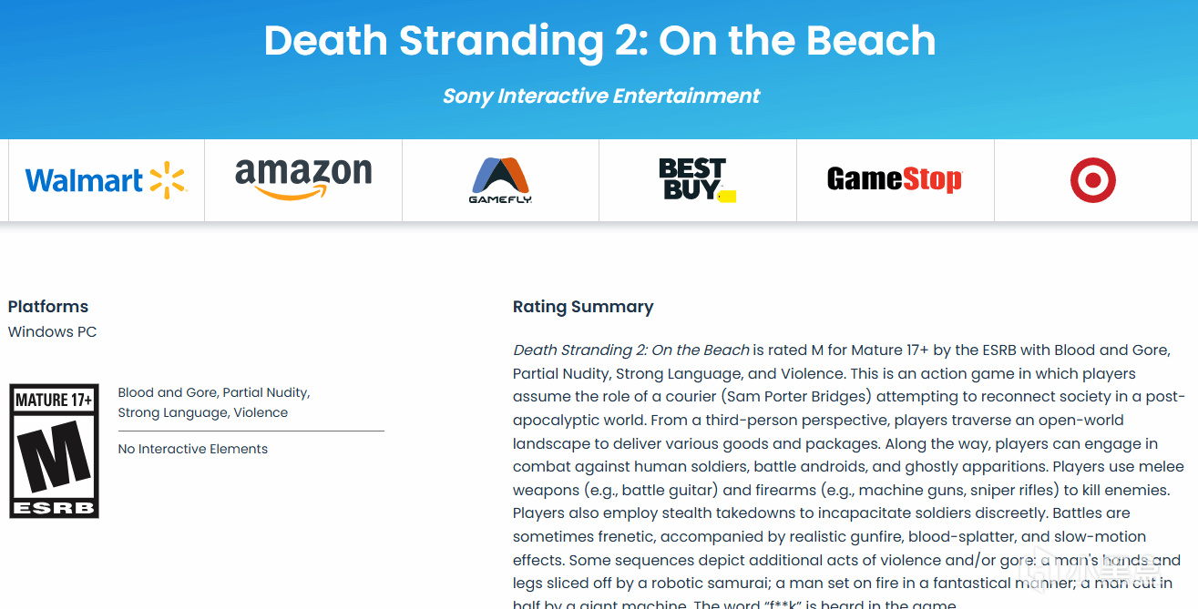 《死亡搁浅2》PC 版近日正式通过 ESRB 审核,被评为 M 级(17+)。评级信息显示,游戏依旧延续后末世社会重建的背景设定,玩家将继续扮演快递员山姆,在开放世界中进行物资运输,并在任务途中与人类士兵、机械单位及灵体生物展开战斗。