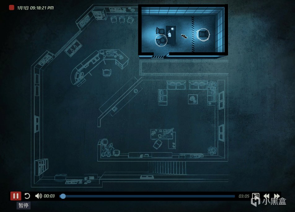 在整个游戏过程中,玩家需要进行的操作只有3点:点击鼠标进行房间的切换及跟随目标的选择,录音时间轴的暂停、回退和快进,事件中出场人物的姓名整理以及最终谜题答案的选择。