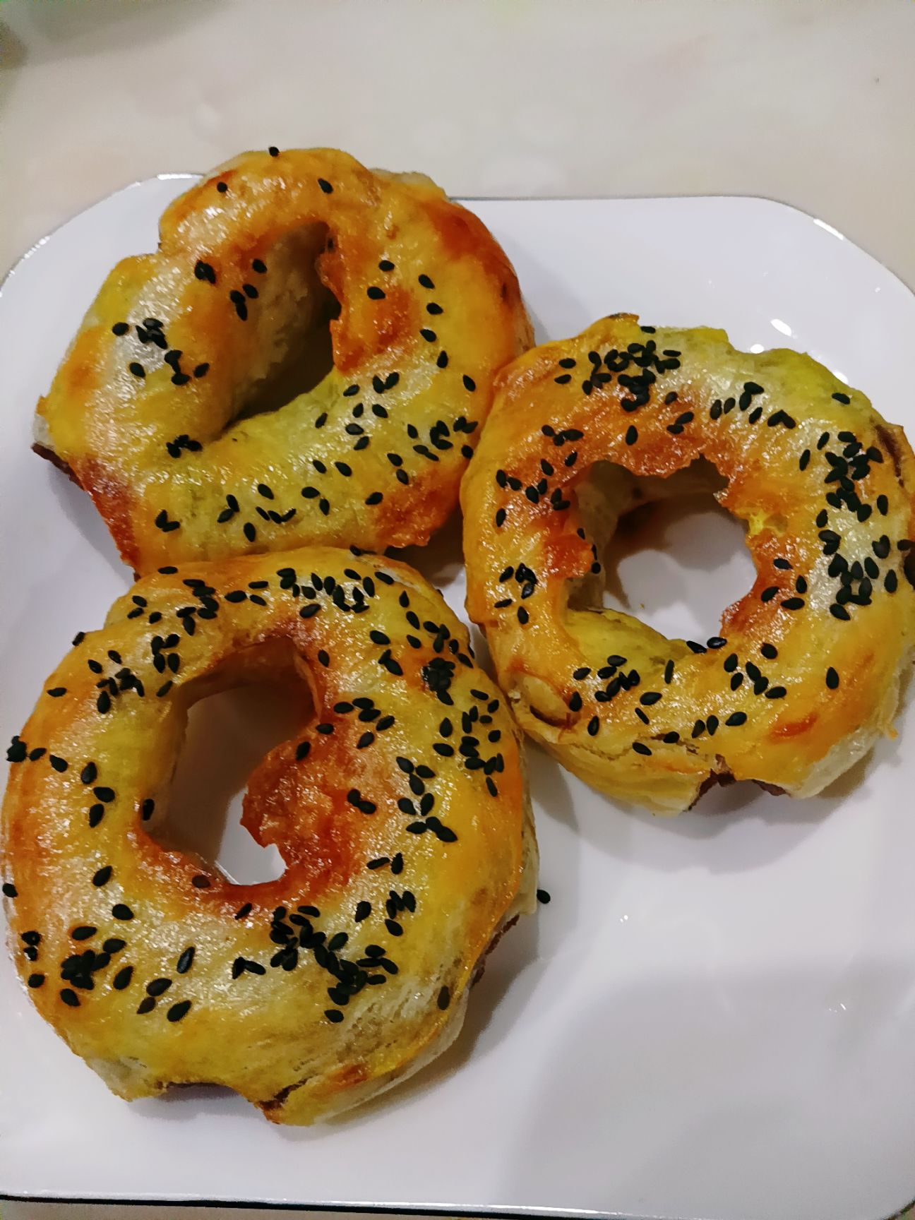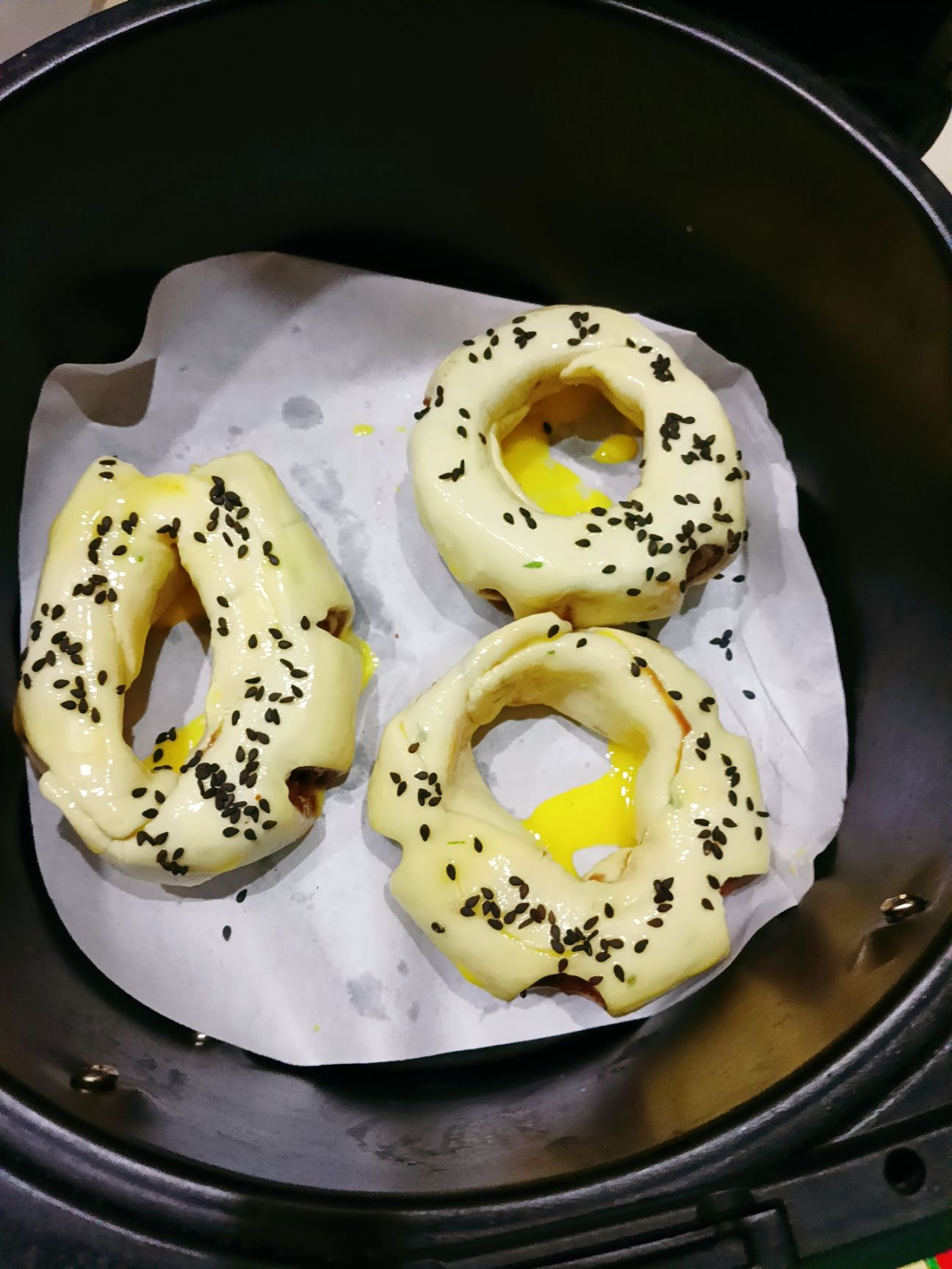 刷蛋液,撒點黑芝麻,空氣炸鍋調180溫度,烤一面7分鐘,另外一面烤7分鐘。