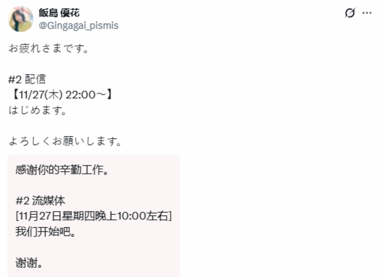 饭岛优花曾表示,参与这部全球知名恐怖游戏系列让她“遇到了全新的自己”。此次直播将是粉丝近距离了解她与角色共鸣的难得机会。