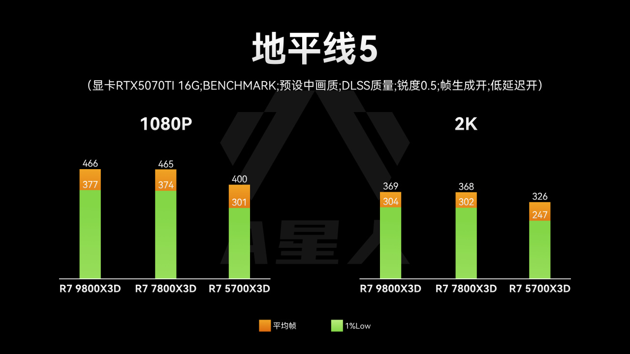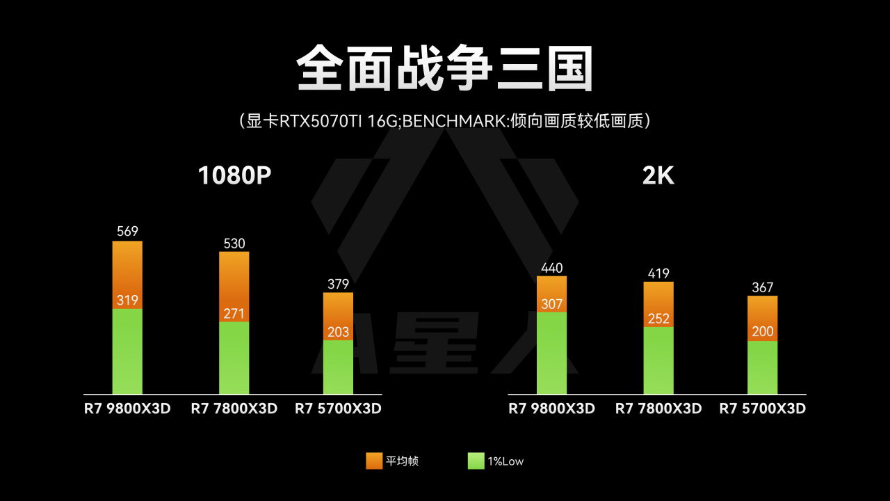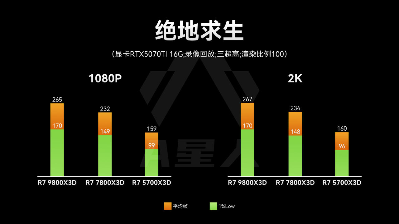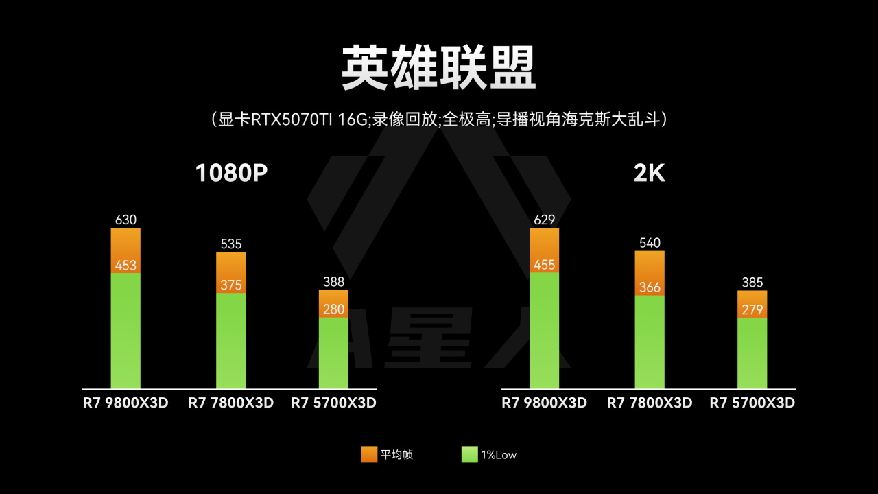 英雄联盟这个游戏主打一个众生平等,1K和2K基本上没什么区别,反正都吃不满显卡。9800X3D对比7800X3D高出100帧 Low帧高出70多,和绝地求生的结论差不多,对比5700X3D就多了近250帧,不过对于这个游戏来说,游戏内超过240帧就没有意义了,帧率越高人物反而会越卡顿。