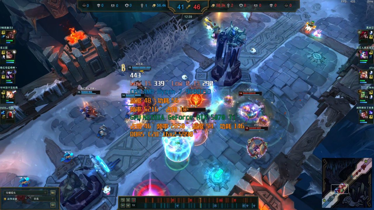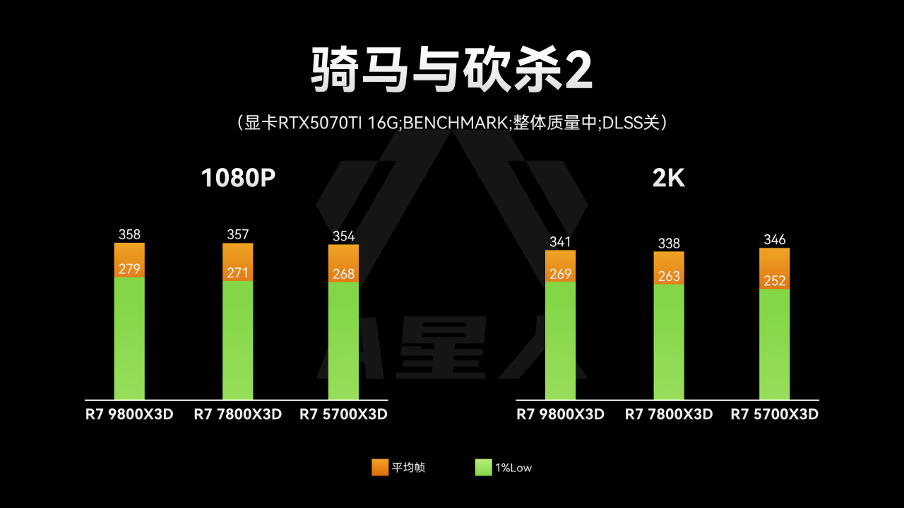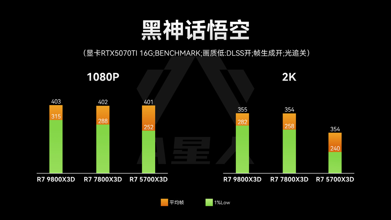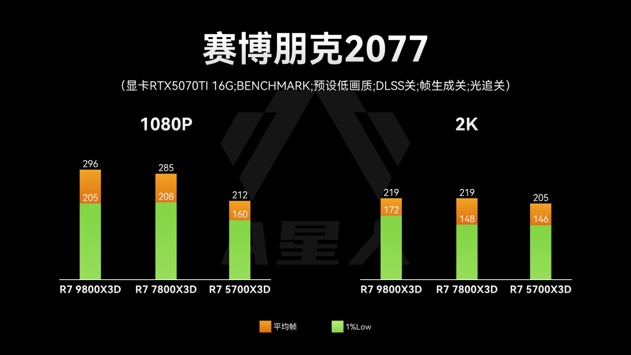 英雄联盟这个游戏主打一个众生平等,1K和2K基本上没什么区别,反正都吃不满显卡。9800X3D对比7800X3D高出100帧 Low帧高出70多,和绝地求生的结论差不多,对比5700X3D就多了近250帧,不过对于这个游戏来说,游戏内超过240帧就没有意义了,帧率越高人物反而会越卡顿。