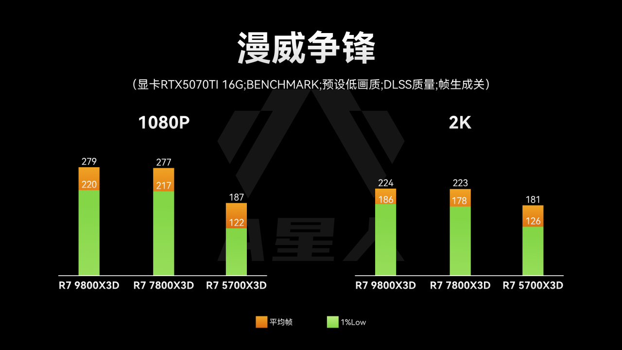 最后一款网游漫威争锋里面9800X3D和7800X3D的表现差不多,5700X3D的平均帧和Low帧都低了100左右。