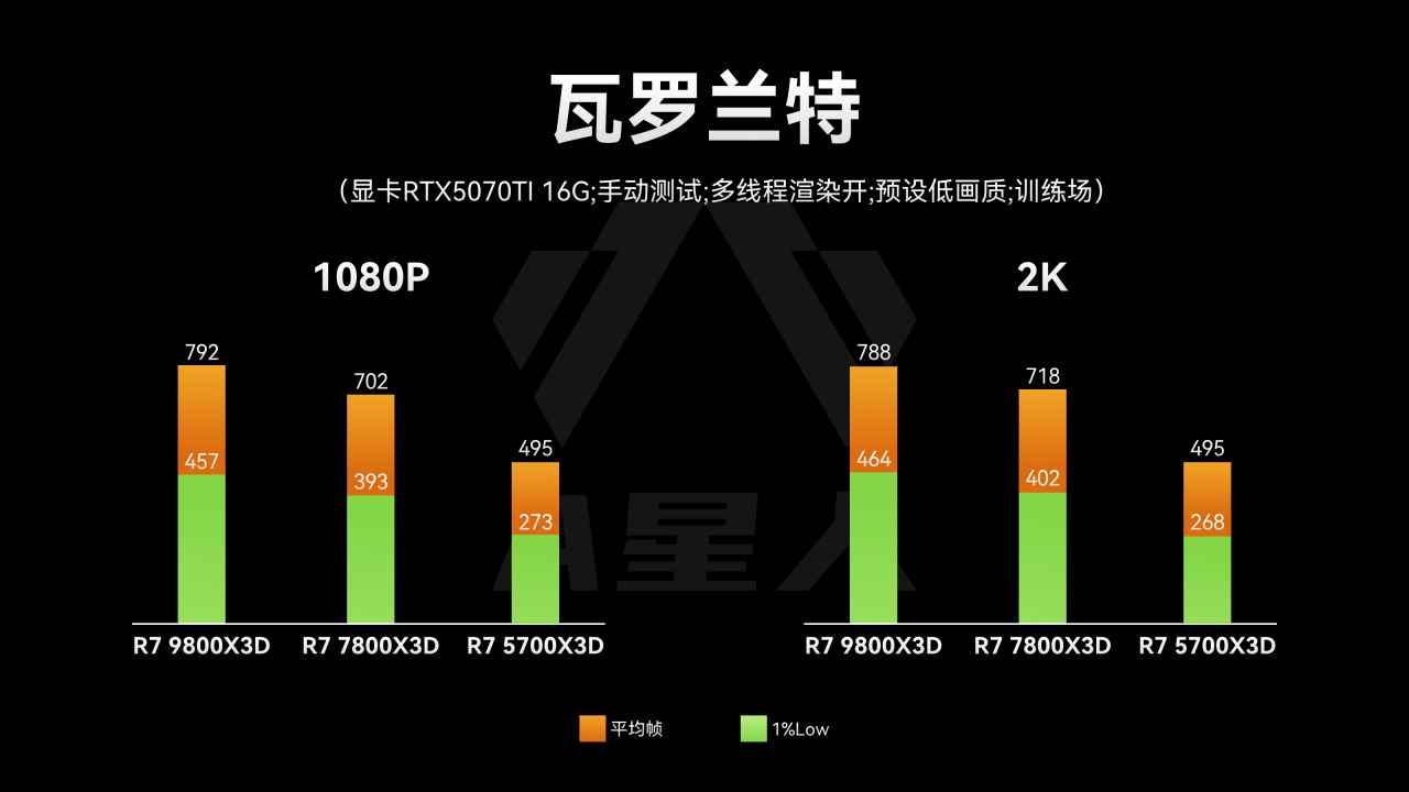 到了瓦罗兰特中,三颗CPU在1K和2K中的表现基本没什么出入,9800X3D平均帧领先7800X3D大几十帧 Low帧领先50帧左右,但对比5700X3D平均帧就提升了300帧左右 Low帧提升快200了,这个提升谁顶得住。