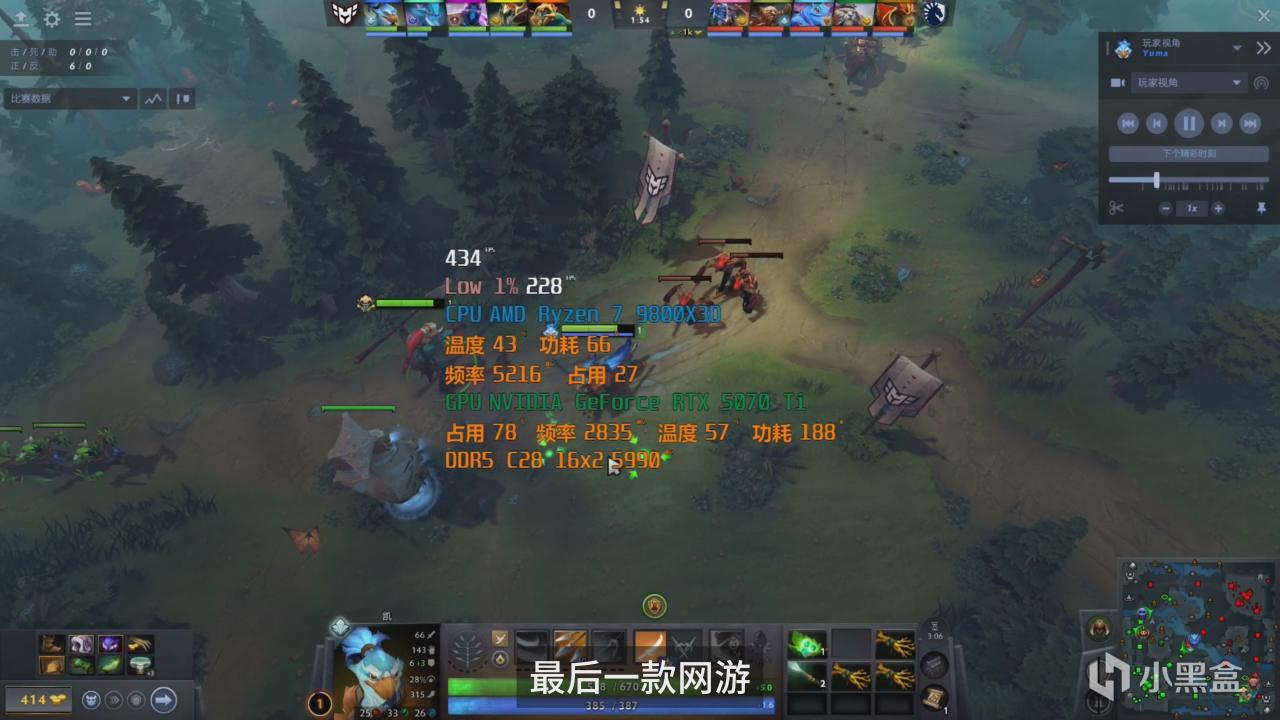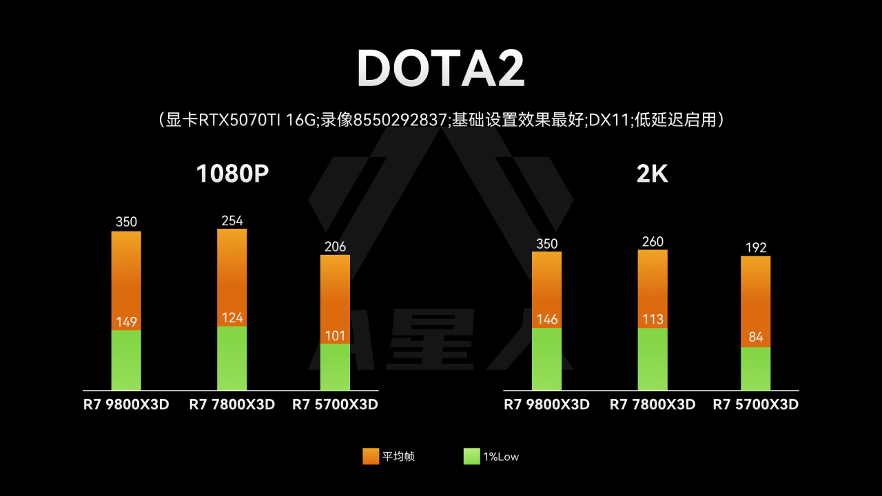 Dota2里面,9800X3D领先7800X3D 100帧 ,7800X3D领先5700X3D 50帧,对于这个游戏来说,5700X3D在1K分辨率的表现还可以 2K分辨率的Low帧就有点拉跨了,100都不到。