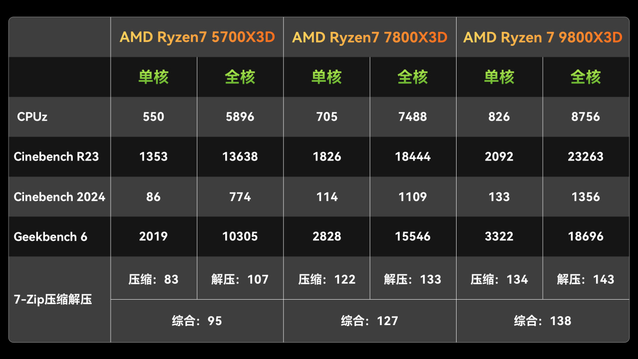 多核心方面,7800X3D对比5700X3D提升27%,9800X3D对比7800X3D提升17%,对比5700X3D提升48%。