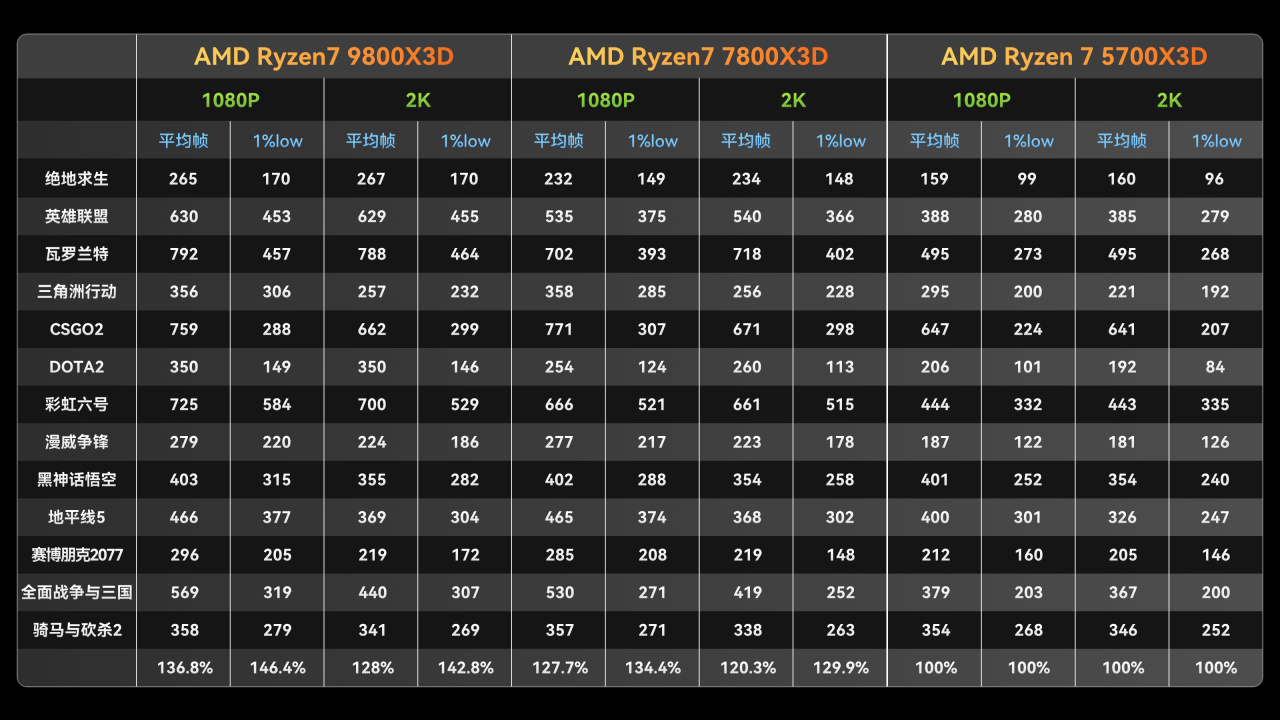 • 另外9800X3D相比较7800X3D的提升大概在 10-15%,结合目前便宜大几百的价格来说,7800X3D依旧是性价比拉满,要是觉得9800X3D价格太贵,7800X3D绝对是一个不错的选择。