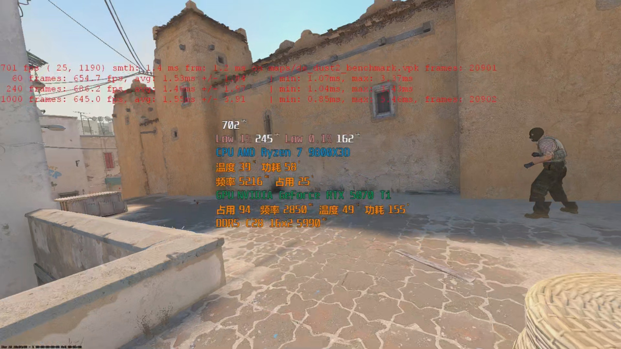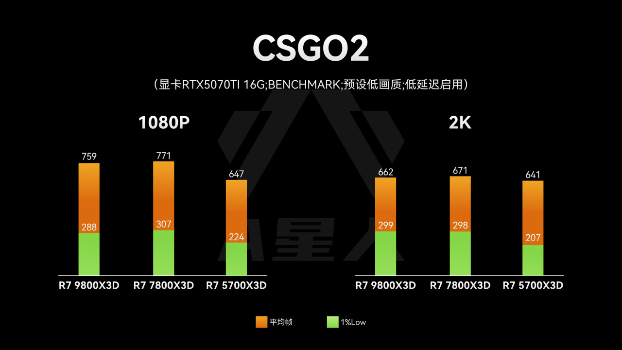 CS2里面5700X3D的平均帧和Low帧,落后9800X3D 100帧左右,而且我们反复测试了几次,这里7800X3D帧率比9800X3D还高一点,也是挺有意思的。