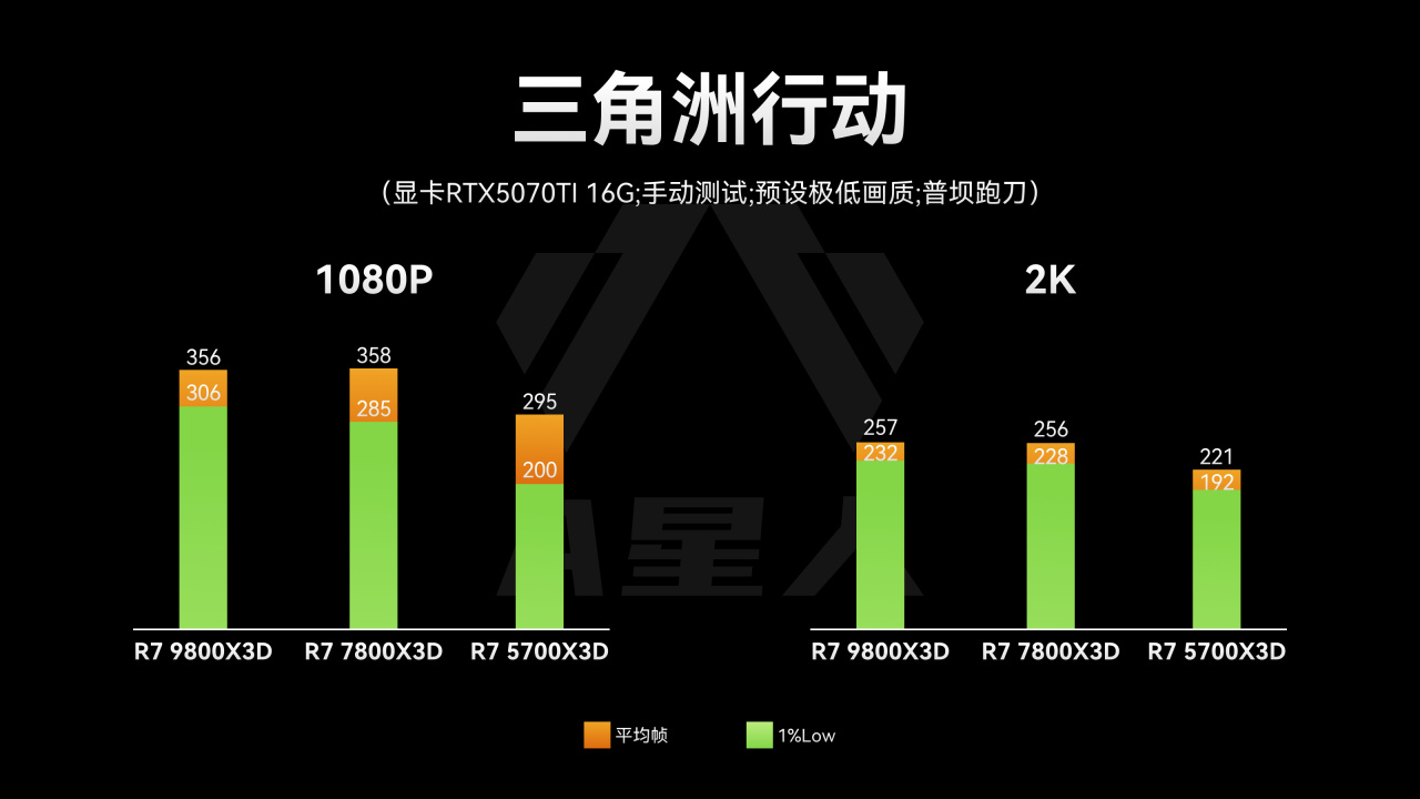 三角洲行动这个游戏的1K和2K就开始吃满显卡了,1K分辨率 9800X3D和7800X3D帧率差不多,9800X3D的Low帧略高一点,5700X3D这里大概率是CPU瓶颈了,1K和2K的帧率落后,两大哥几十帧 但差距没有特别大。